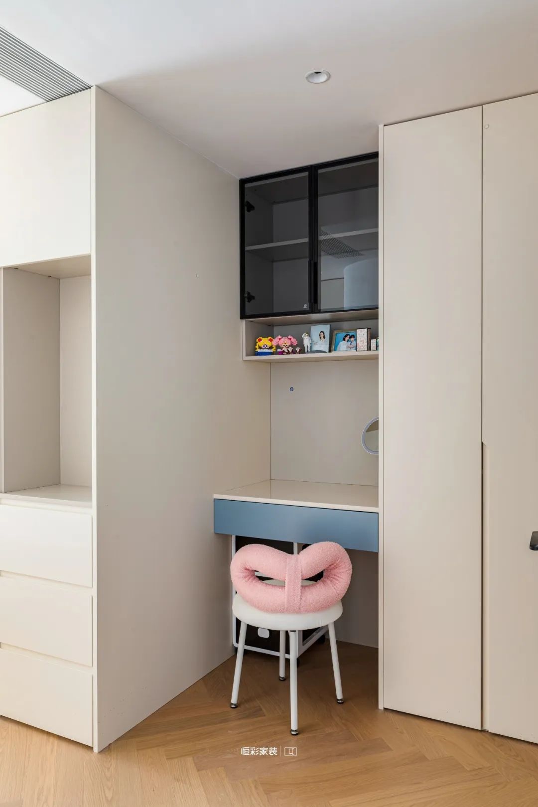 床头设计了悬空书桌,给孩子提供了一个独立的小天地。这里既可以是学习的角落,也是绘画、阅读和玩耍的乐园。悬空书桌节省了地面空间,让孩子在这里自由地探索和创造。