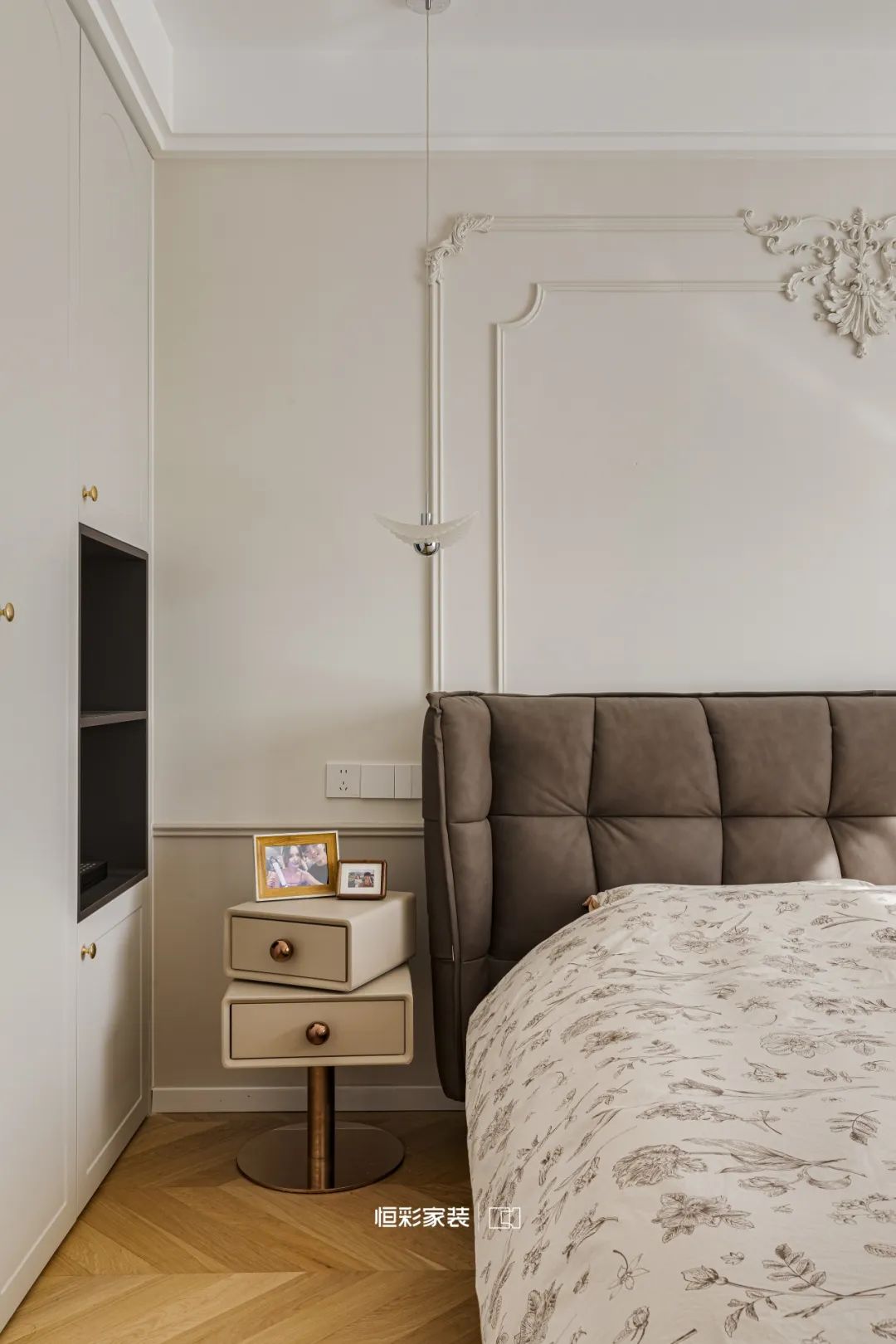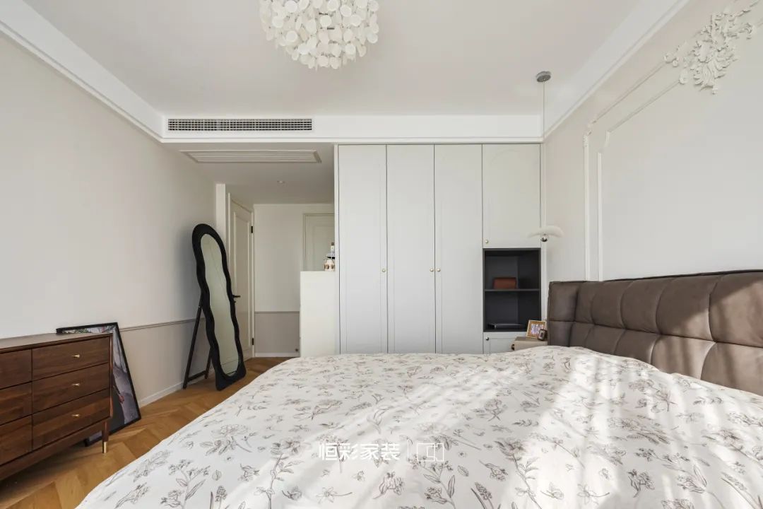 米白乳胶漆墙面搭配法式石膏线,勾勒出主卧的高贵典雅,讲述着时间的年轮。人字拼木地板铺就出一曲岁月的赞歌,每一步踩踏似乎都能听到历史的回音。