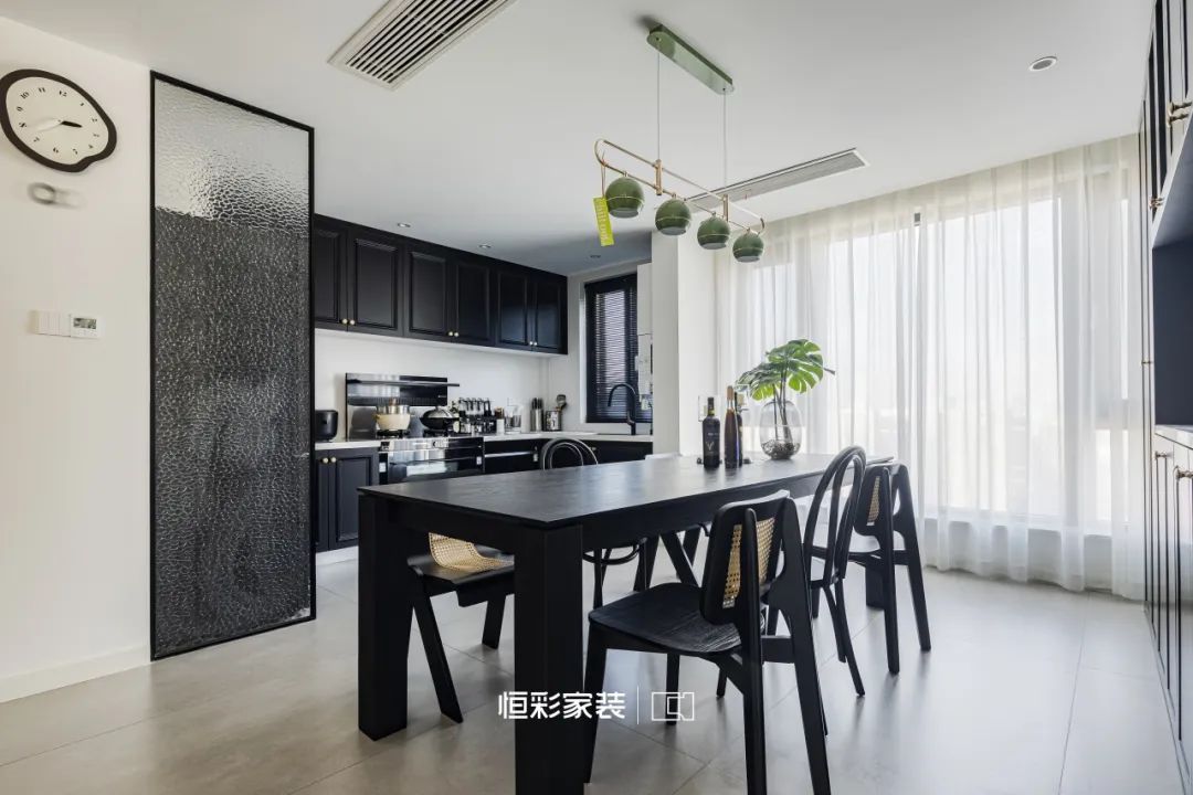 黑色餐桌椅靠窗而立,零星藤编元素与圆润拱形相映成趣,将混搭美学演绎得淋漓尽致。琉璃绿金吊灯静静垂挂在餐桌上方,复古的光泽增添了一抹古典奢华。