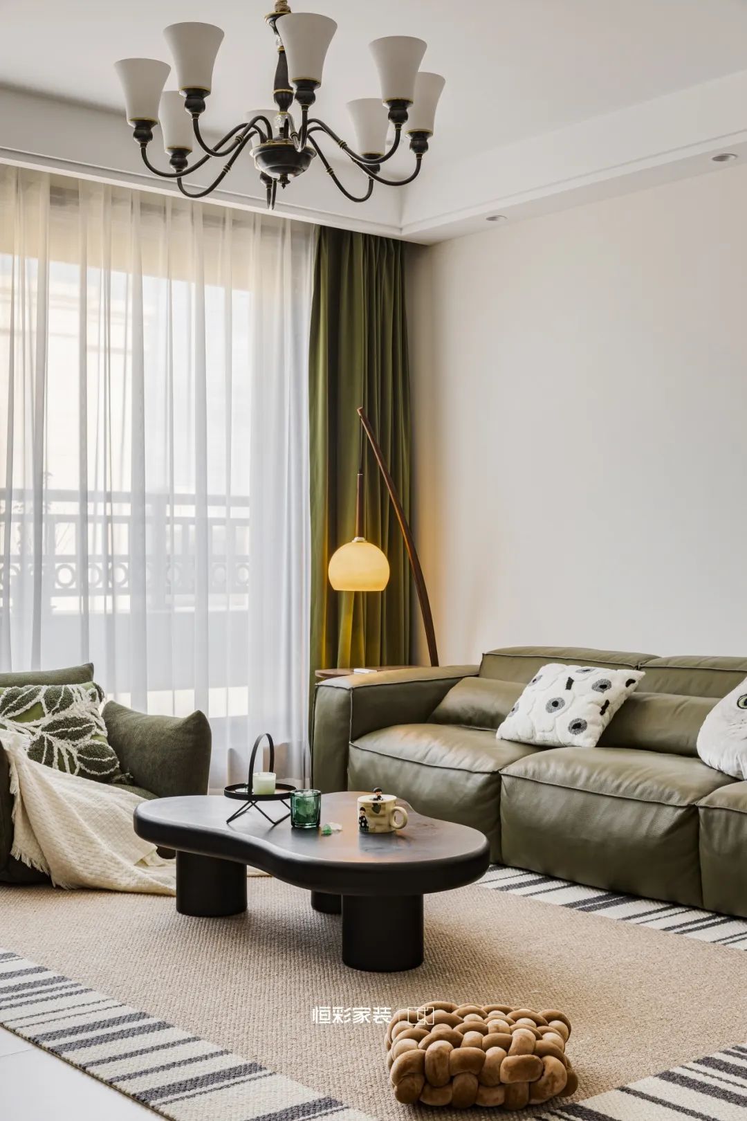 客厅中央黑色异形茶几以其独特的轮廓,打破空间的沉默,成为视觉焦点,静静诉说着设计之美。脚下的地毯恰似一片柔软的草地,让人在步履之间感受大地的包容。