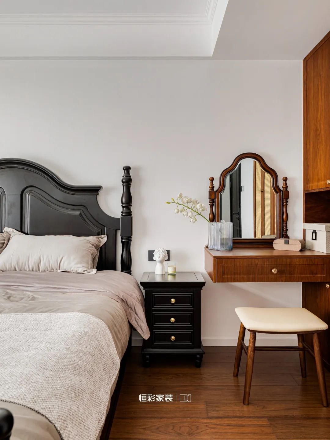 黑色实木床如光华流转的伴奏,彰显优雅矜贵。墙面刷上温暖的奶白色,恰到好处的浪漫,带来不言自明的温柔。复古花朵吊灯如时光追忆,在光影间闪烁。