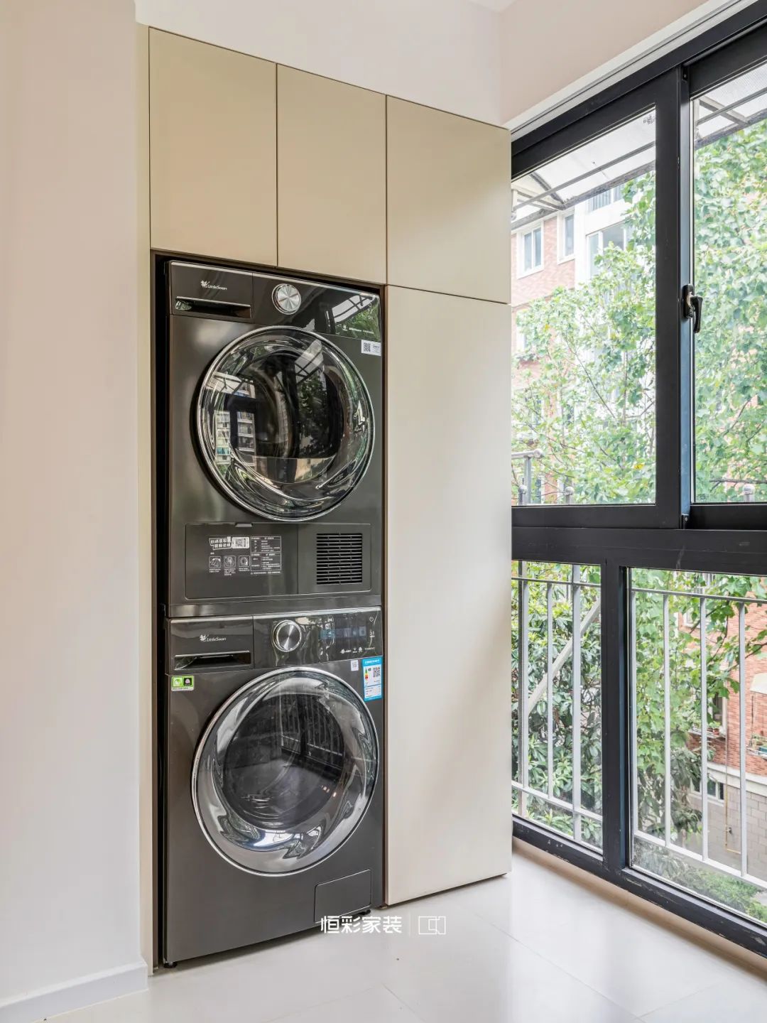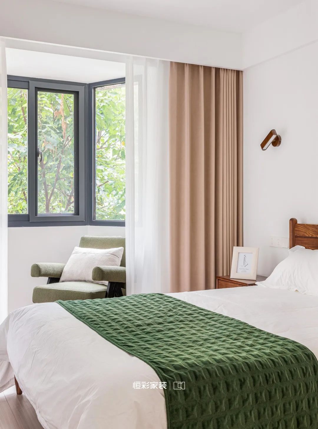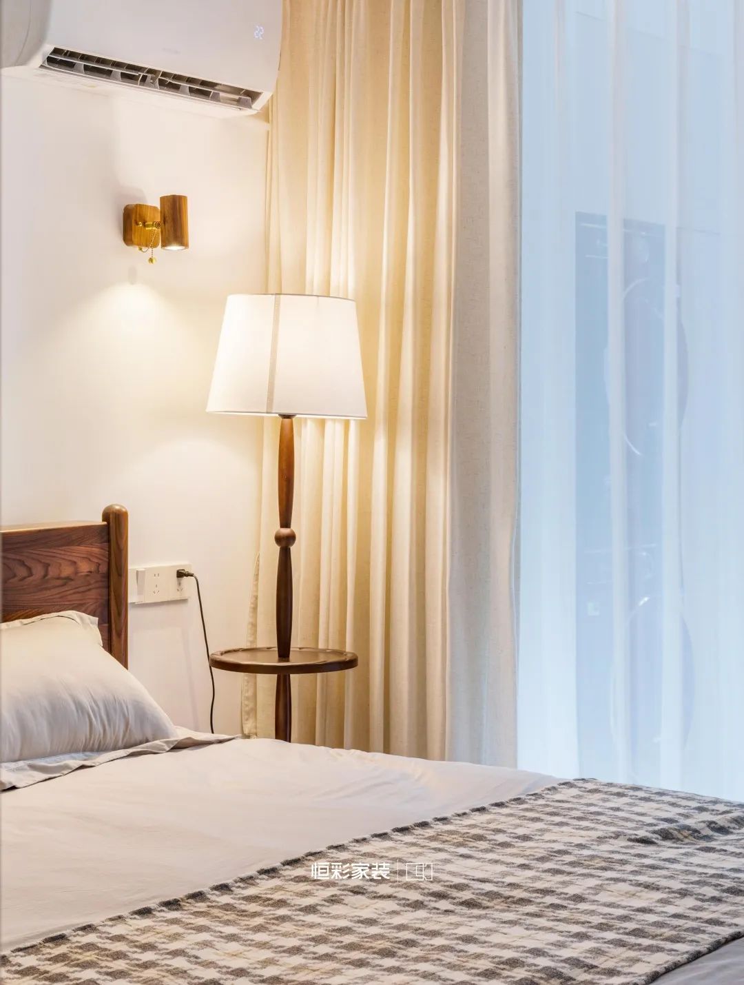 透过窗洞窥见淡烟疏雨、簪星曳月,只余较纯粹的致远。阳光透过窗隙洒落,似有似无,朦胧顿生。次卧似主卧般清冷纯净,心绪柔和成诗。