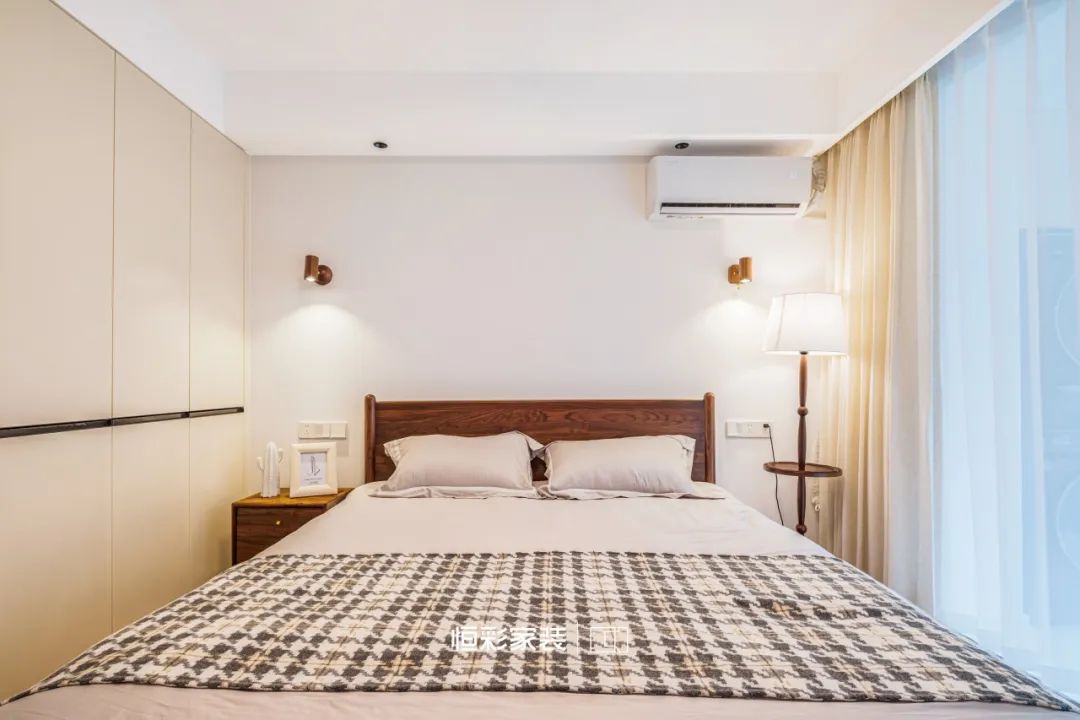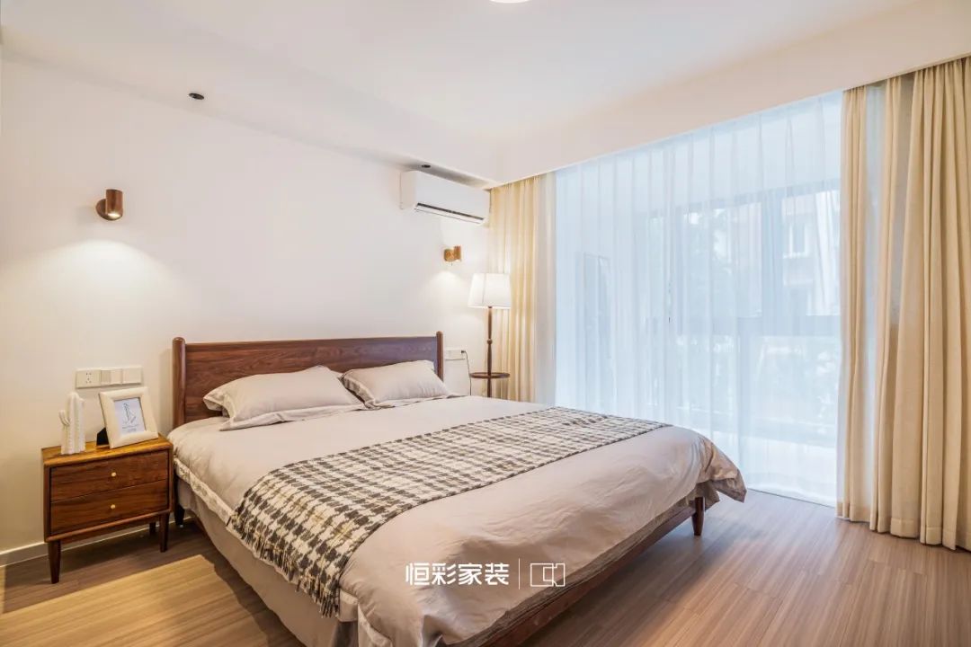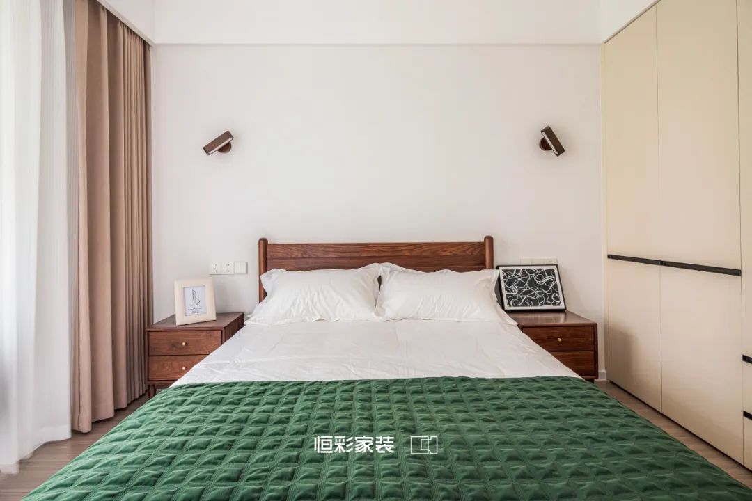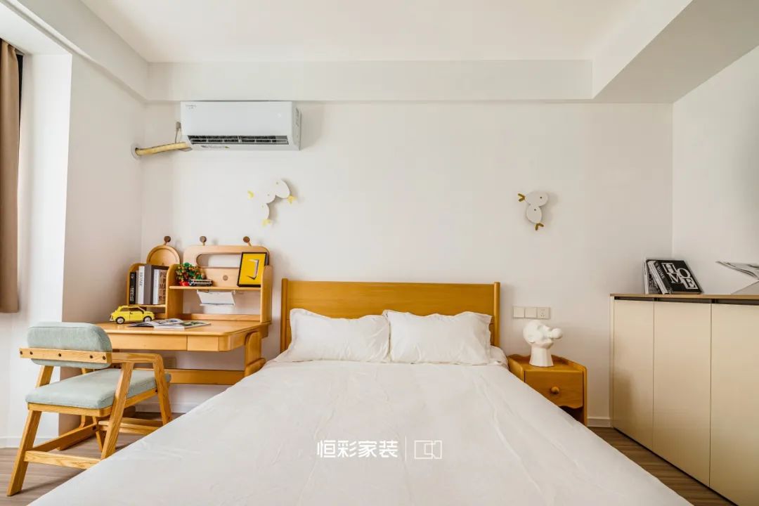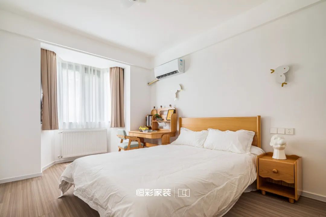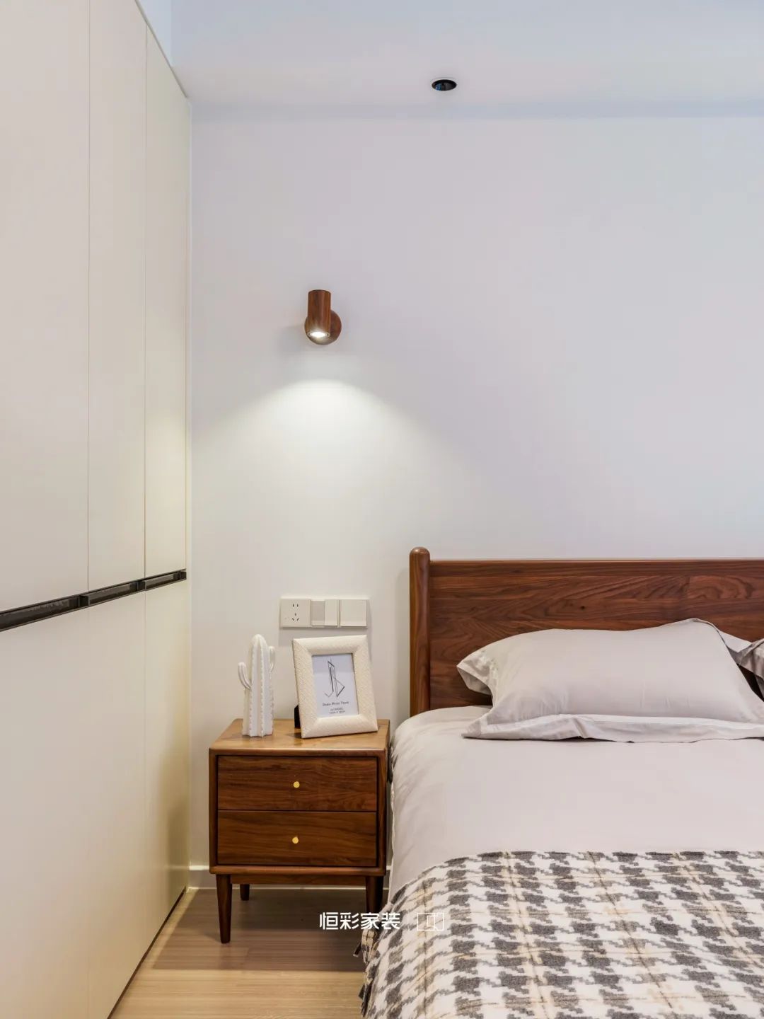 实木床与床头柜温润如初秋的晨露,淡淡的木香在空气中萦绕,仿佛岁月的精雕细琢,带来无尽安宁。衣柜的米白映衬几许恬静,生活的琐碎化作流光,藏于其中。