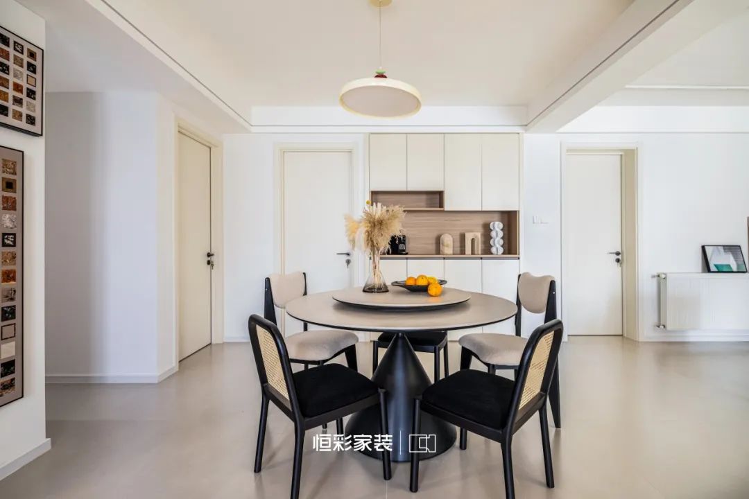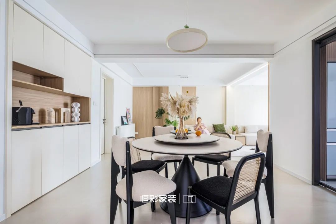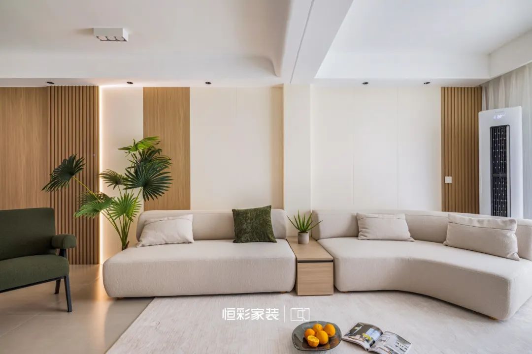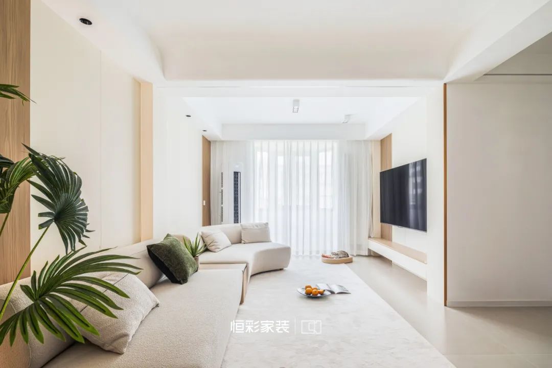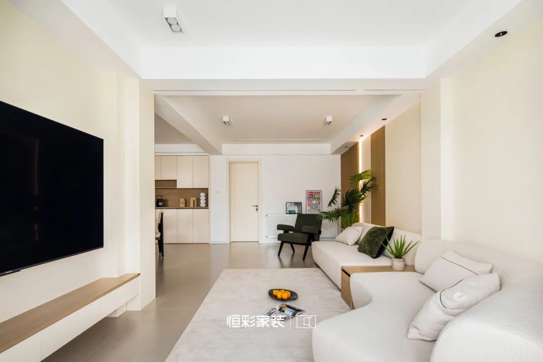 全屋统一奶油色调,重新调整布局后,扩大客厅空间,由南北方向调整为东西方向横向客厅,扩大厨房空间,设计隐藏式移门,开阔明亮。