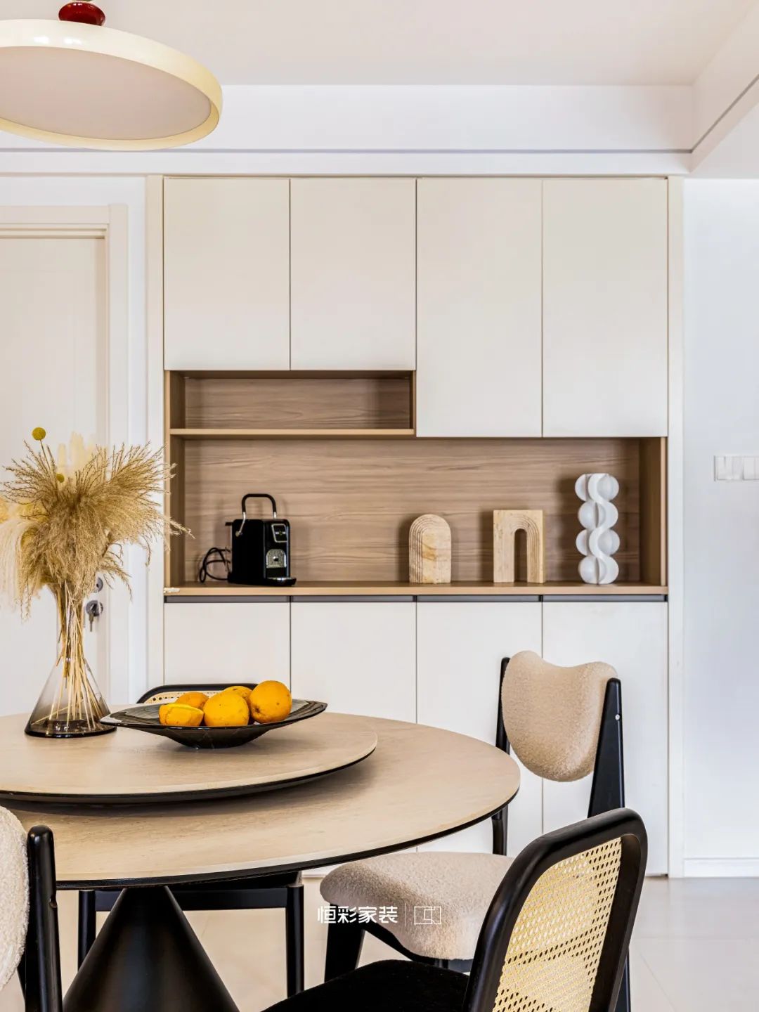 高柜流光溢彩、错落有致,奶白柜门、原木柜体织就幽幽剪影,此时无声胜有声。芦苇干花仿佛一抹淡淡的晨光,唯美与柔和浓郁渲染开来。