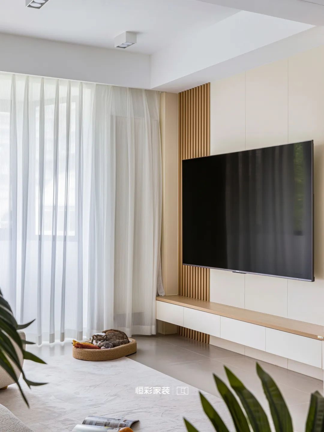 壁挂电视宛若一扇通向未知的窗口,透过它,似乎可以窥见远方的星辰。地台如云朵般轻柔,安然静立,承载思绪漂流,穿梭虚与实的边界。