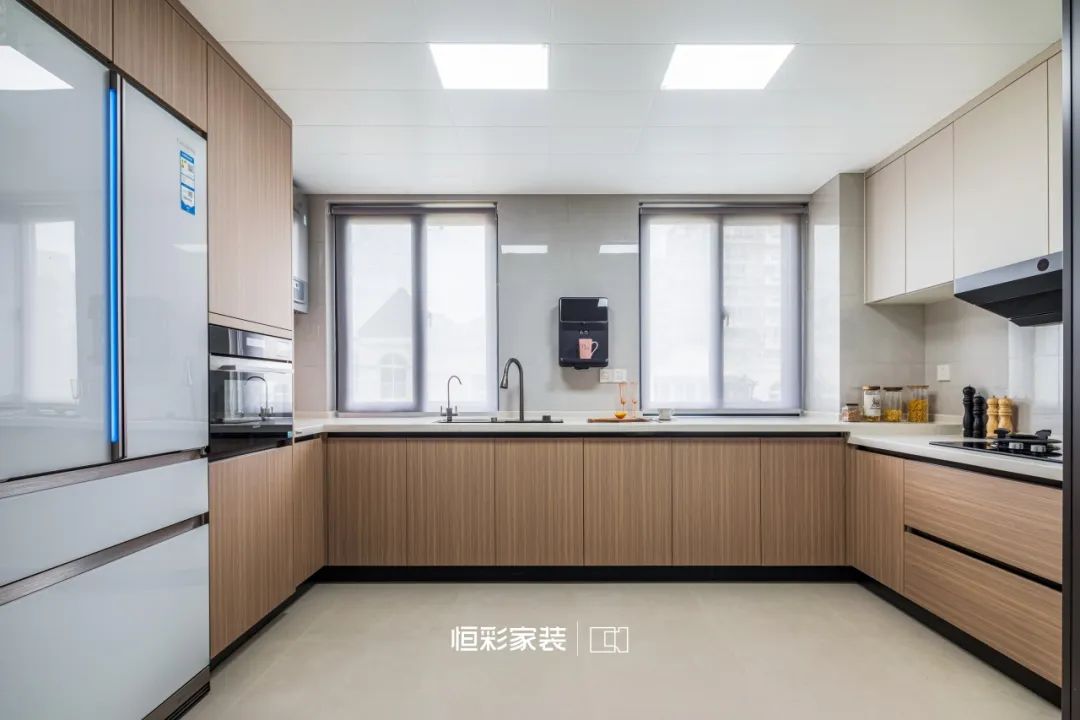 橱柜每一寸蕴含匠心独运的礼赞,净水器宛如时光馈赠,一汪清泉,一枕槐安。左侧冰箱静默伫立,秋风中的飘零绵延至无尽的远方。