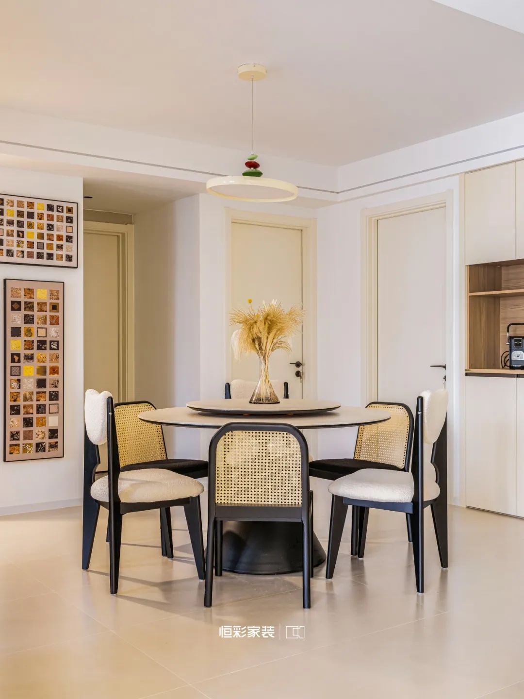 餐厅迷离惝恍、流绪微梦,奶油风飞碟吊灯杳霭流玉,夜暗方显万颗星,灯明始见一缕尘。复古餐桌藤编餐椅的奇幻邂逅,镶嵌在奶油蛋糕屋中,浮生若梦,煦色韶光。
