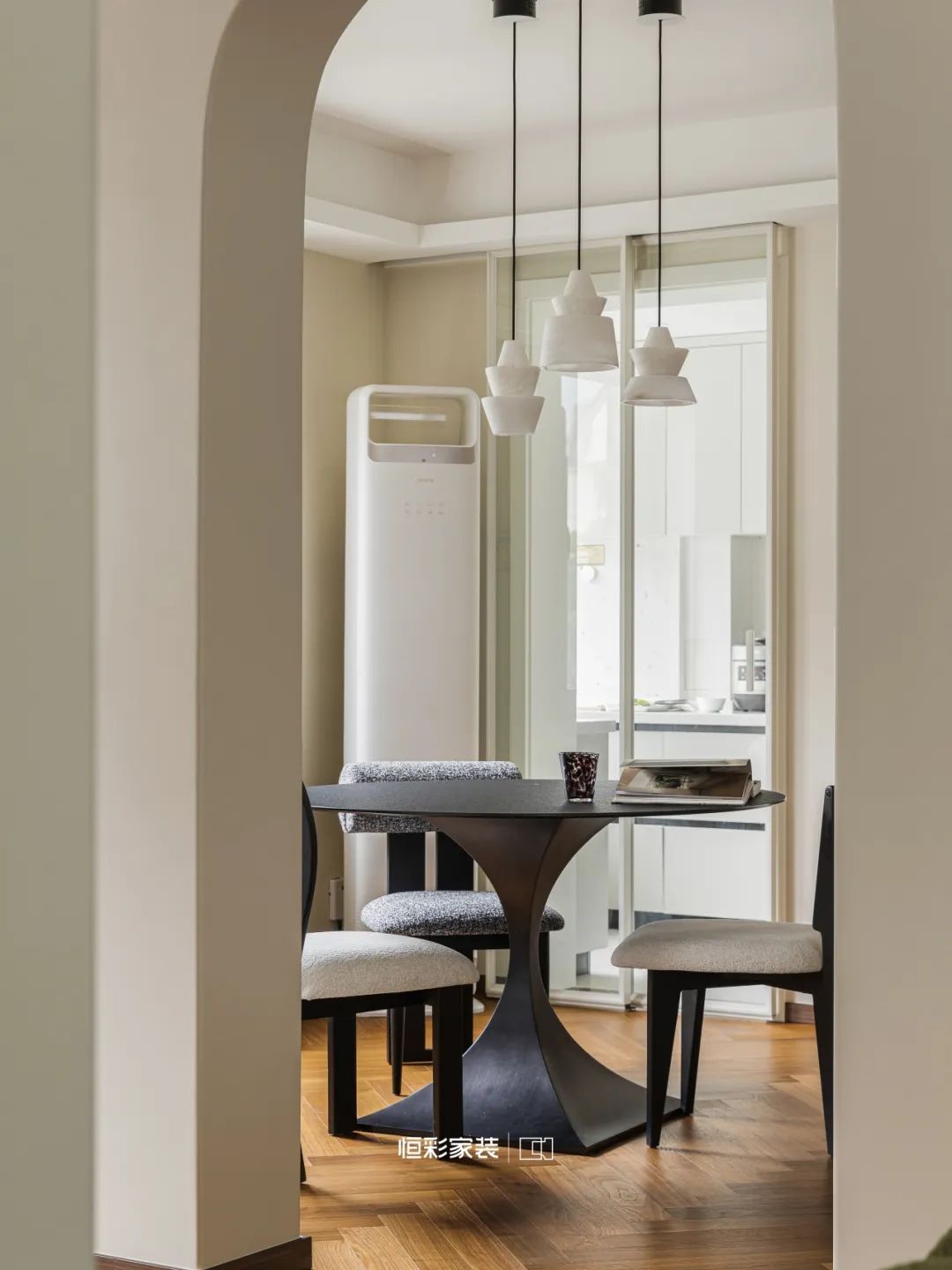 唱片音箱好似与时光共舞,一抹淡淡的中古韵味在这灯影之下如一缕遥远的梦。圆拱形门洞如同画框,将绿意与阳光温柔引入室内,成为一幅四季更迭的自然画卷。