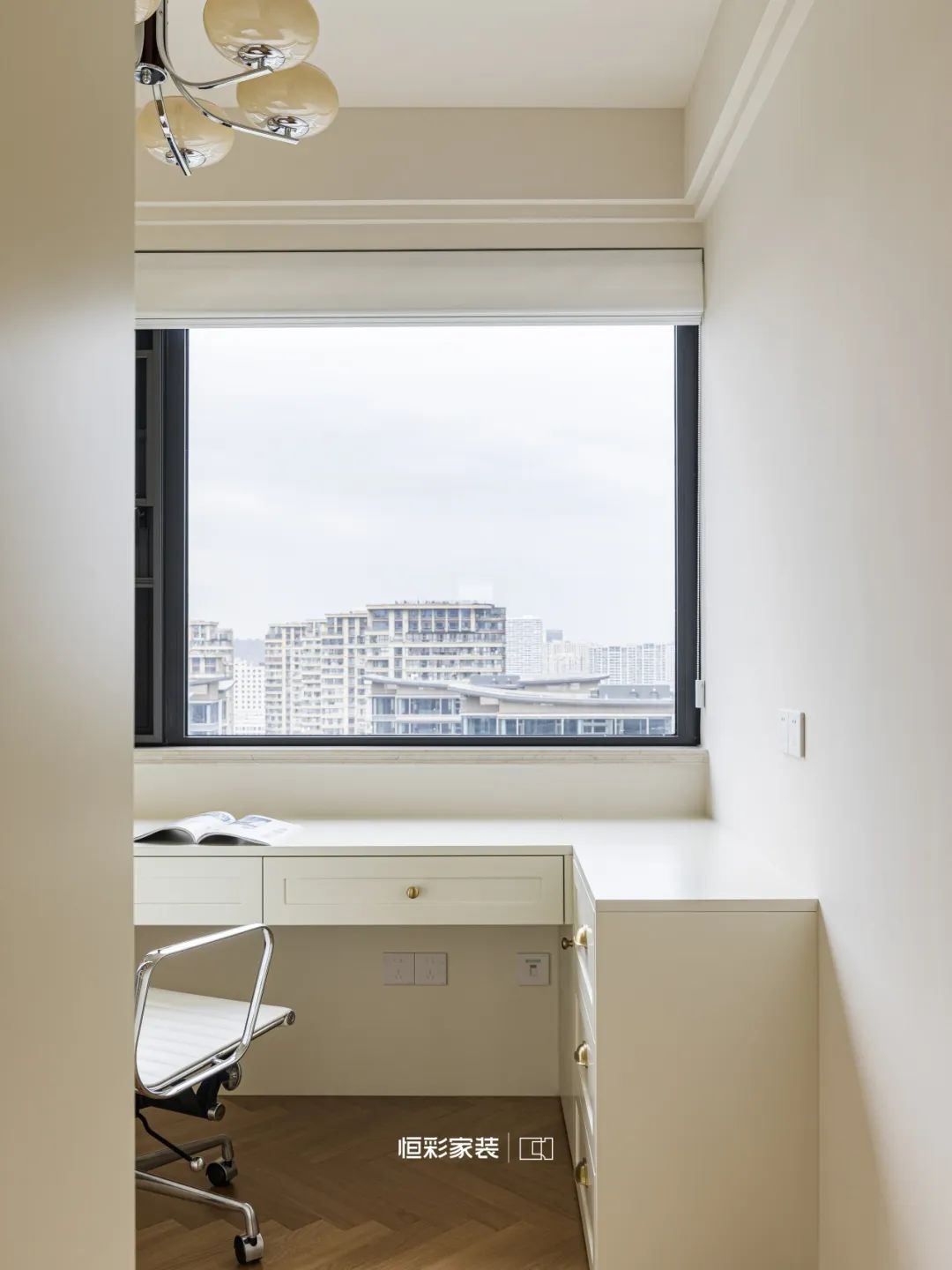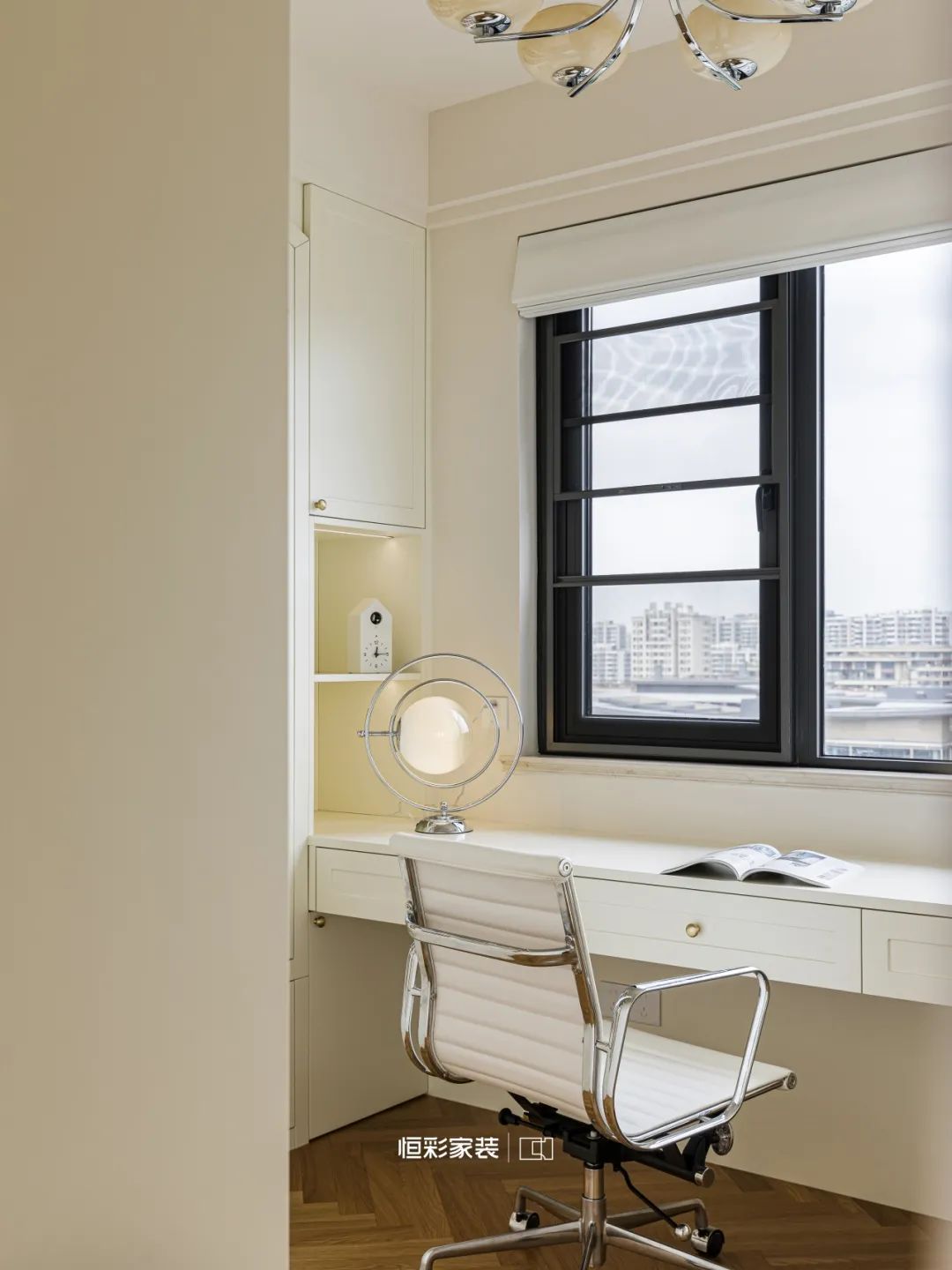 悬浮书桌自光中生长,奶油柔和干净,星球旋转台灯静静守护这个角落,包豪斯电脑椅将喧嚣轻轻拂去。
