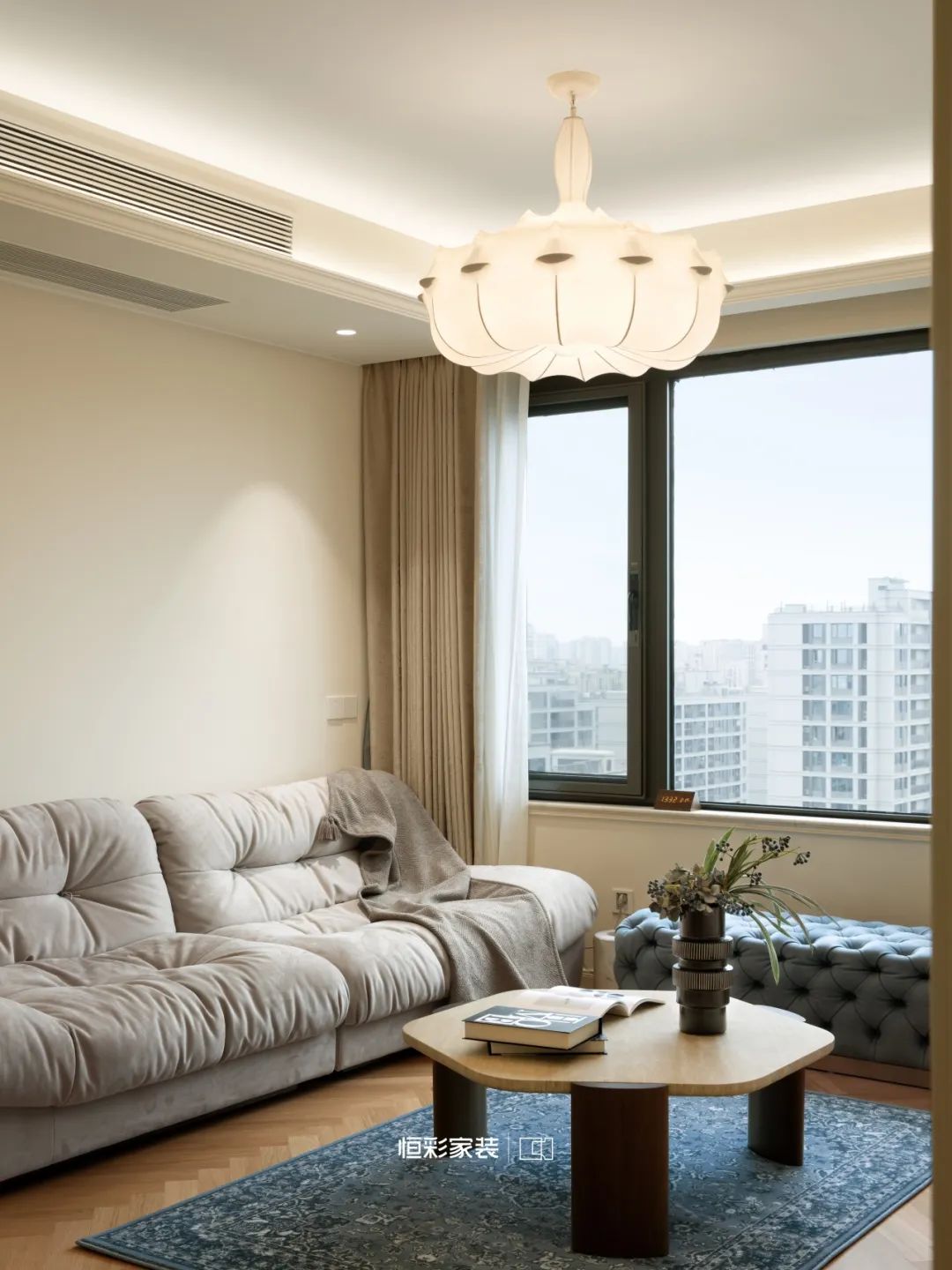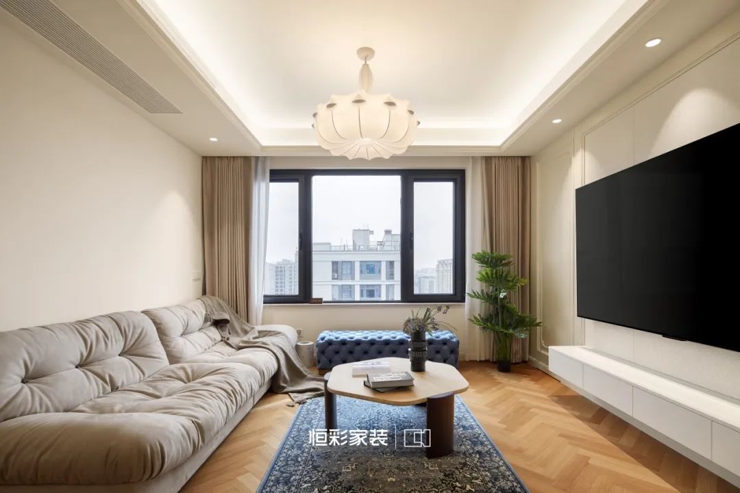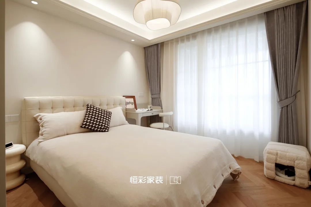奶油蚕丝吊灯如夜空中闪烁的流星,衣柜的米白映衬几许恬静,焦糖地板像是大地的画布,每一步都在诗行跳跃。