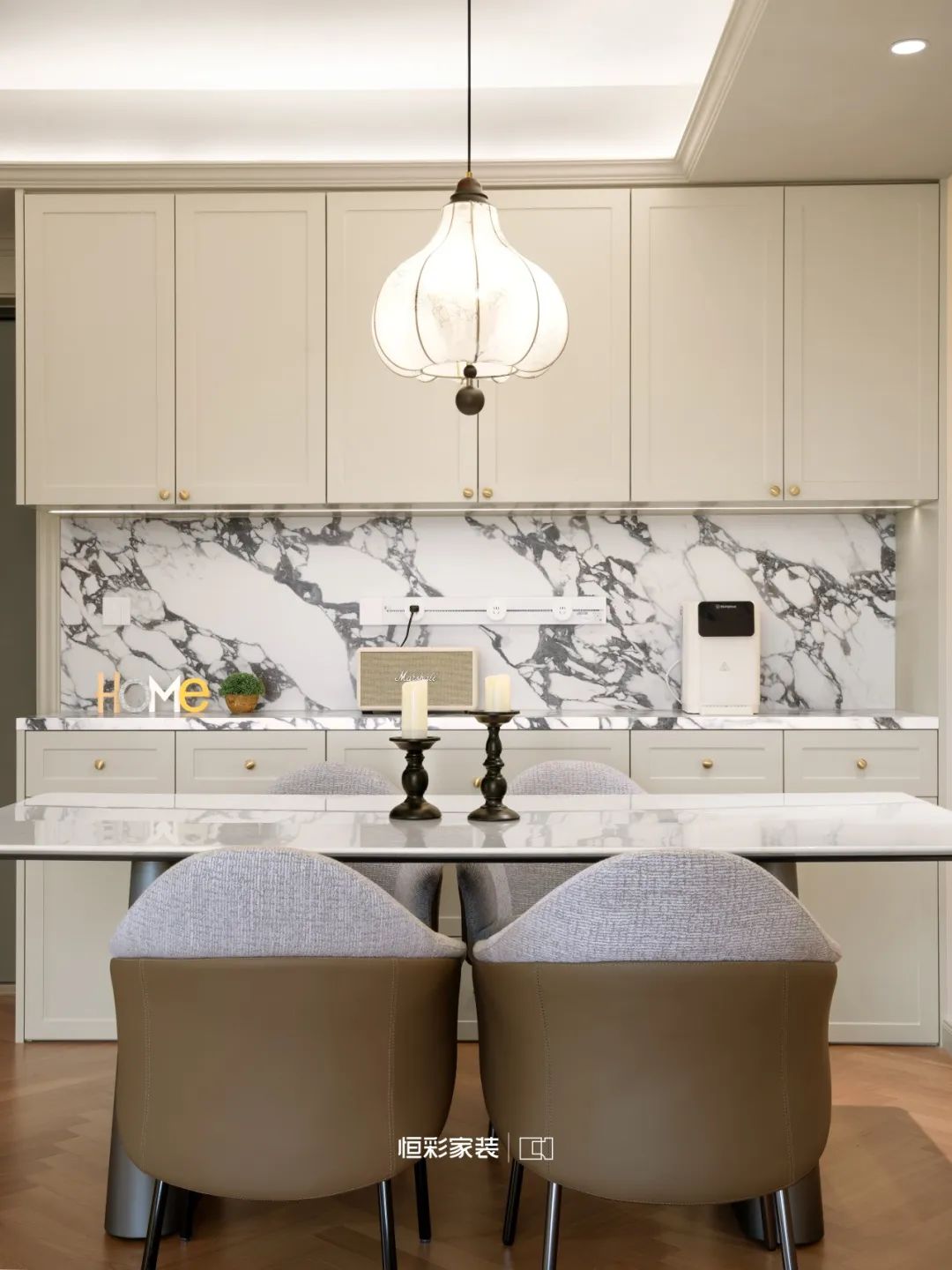 纯白餐边柜飘然而立,吟唱法式浪漫,金色把手诉说光影诗篇,马歇尔音响点缀其上,烟火气与艺术感在此聚散。