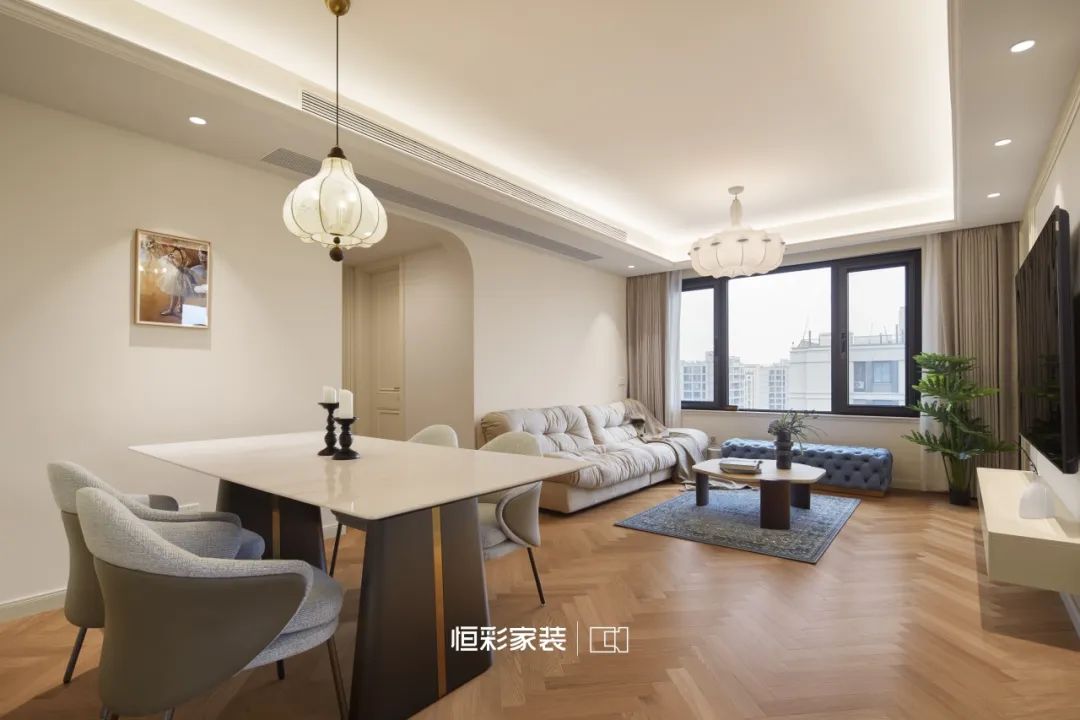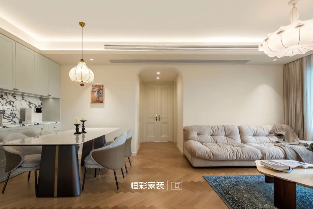 新居一家三口居住,一家人都喜欢浪漫的法式风格,对于家的品味及要求偏高,全屋大面积运用白金色调,原户型较为规整并无大改,在空间规划上稍作调整,重新规划后,打造开放式客餐厅,视野开阔,通透感显著提升。