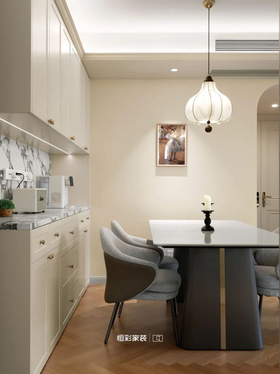 岩板餐桌与棉麻餐椅沐浴在岁月洗礼下,法式布艺吊灯似星辰静静垂挂,罗马柱香薰台与古典油画浓郁渲染开来。