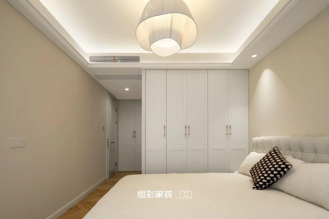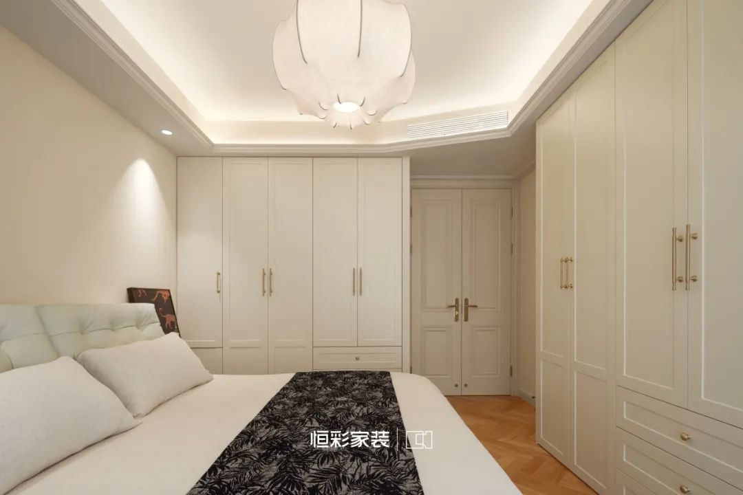 法式艺术吊灯轻盈精致,每一束光柔和又有层次,衣柜好似浩瀚星幕,虚实间勾勒出梦的边缘。