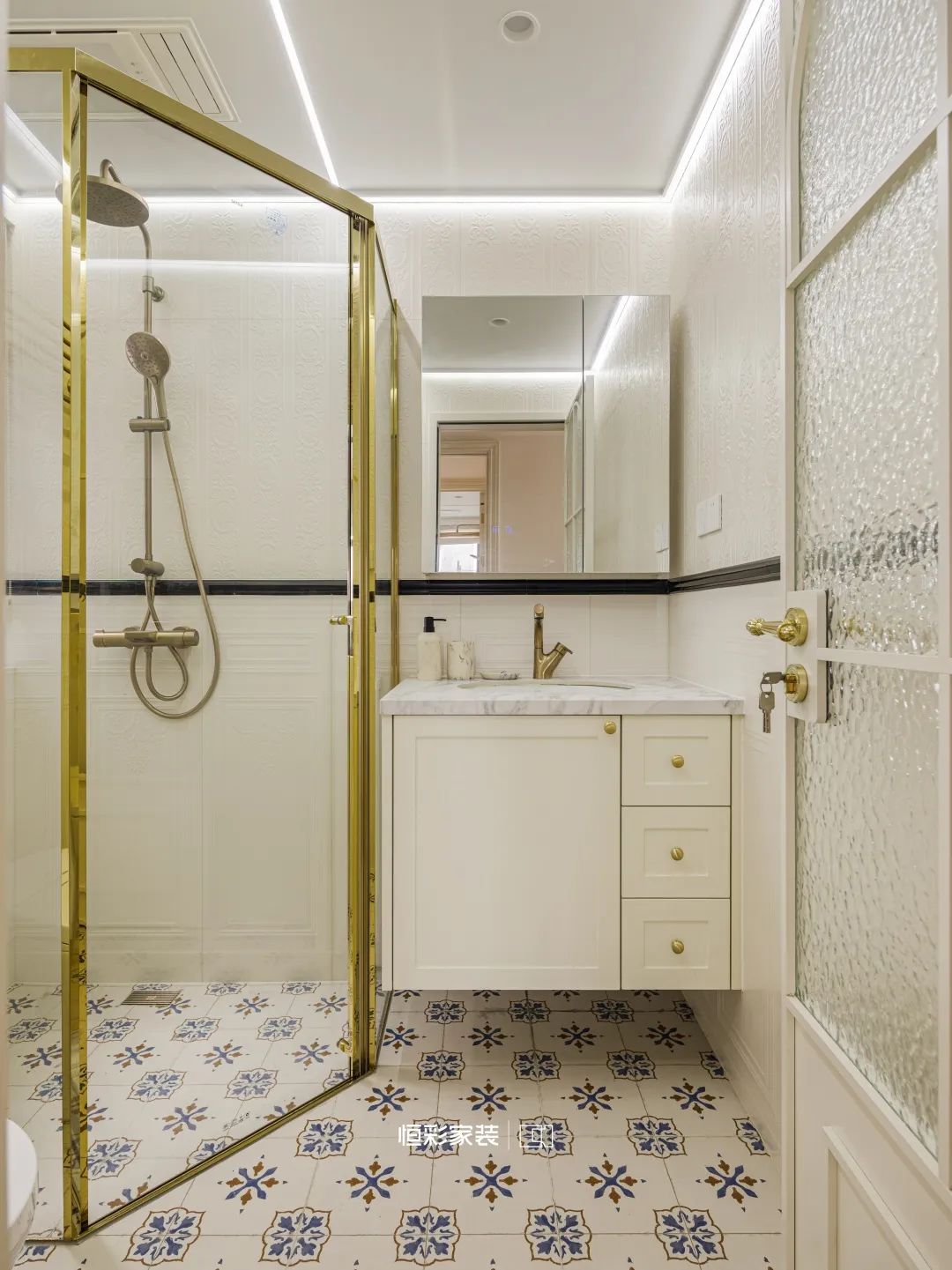 新家两个卫生间化身艺术角落,复古花砖清新脱俗,白金好似从自然中采撷而来,法式护墙板投下细碎光影。