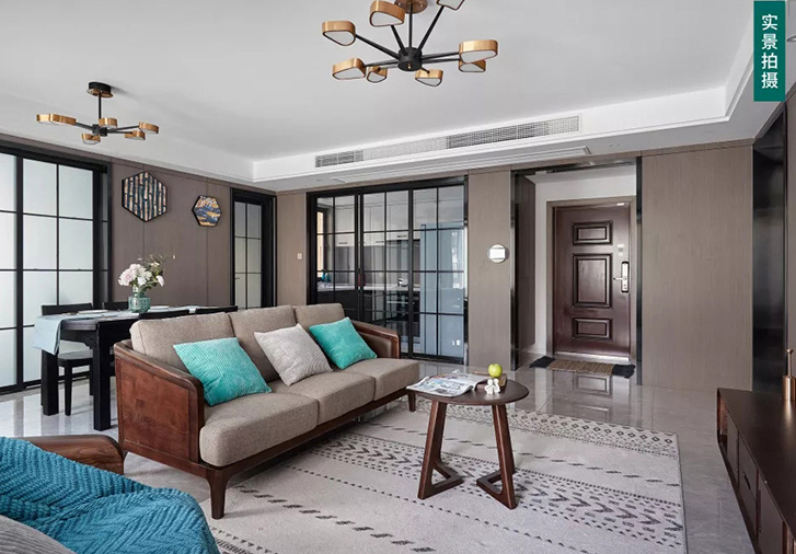 胡桃木色家具简单大气,浅棕色布艺沙发软垫搭配绿色抱枕,对比度很高。