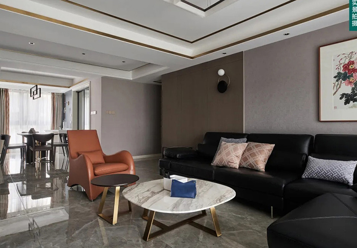 浅灰色大理石纹抛光地砖质感光洁,搭配整体棕黑调的配色,更显高级。深空黑色皮质多人沙发搭配棕色单人沙发椅,撞色的选择让空间多一种选择。