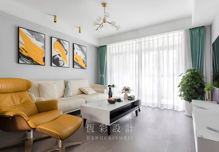客厅浅色系背景清爽柔和,乳白色沙发搭配浅灰色背景墙,像柔软绵密的牛奶糖,甜蜜度爆棚。姜黄色的单人沙发椅搭配同色系装饰画,在整个空间起到提亮作用,清新之余,添一笔赏心悦目。