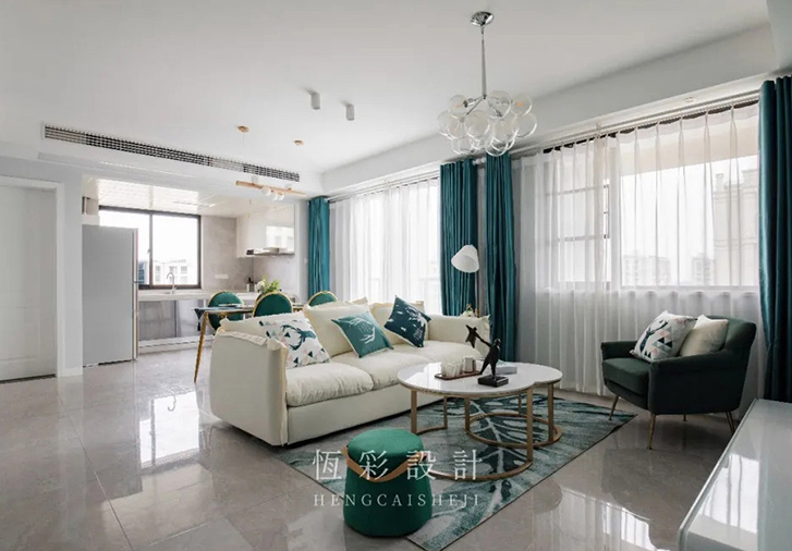 客厅以白色作为大面积背景色,绿色软配作为主角色,起到装饰作用。家具中偶有的金属元素加以点缀,小造轻奢感。