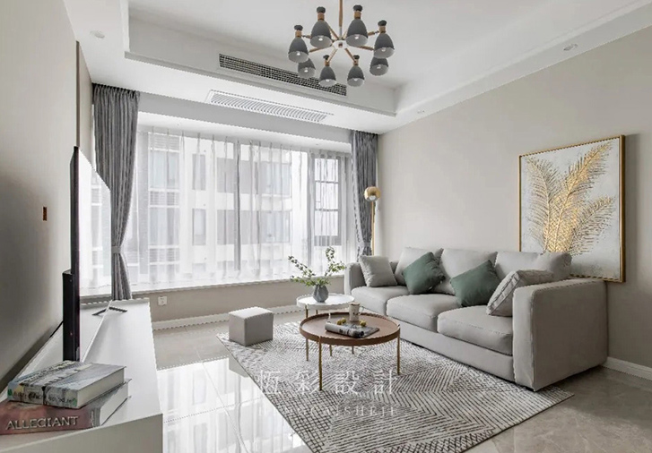 搭配浅灰色三人沙发,简约高级。客厅阳台改飘窗,增加整体空间感。