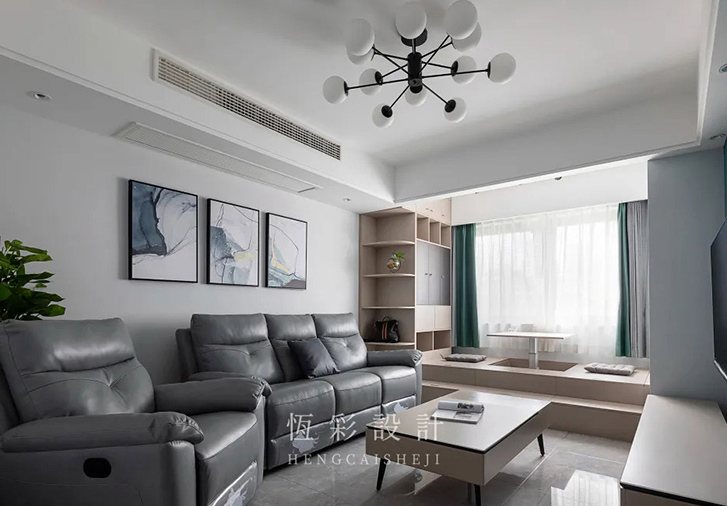 多功能区选用两层的窗帘,兼具采光、遮光双重功能,透过白色的首层纱帘洒下日光的同时,也能很好地保护了隐私性。外层撞色窗帘是时下的大火元素,绿与灰的颜色选择碰撞出高级时尚感。定制柜承担收纳之能,给客厅一丝干净。