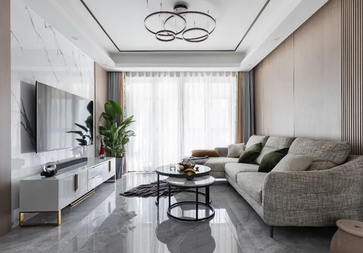 浅咖色布艺组合沙发,搭配木饰面板作为沙发背景墙装饰,提升空间质感。简单错落的黑白圆形小茶几增添小心机。