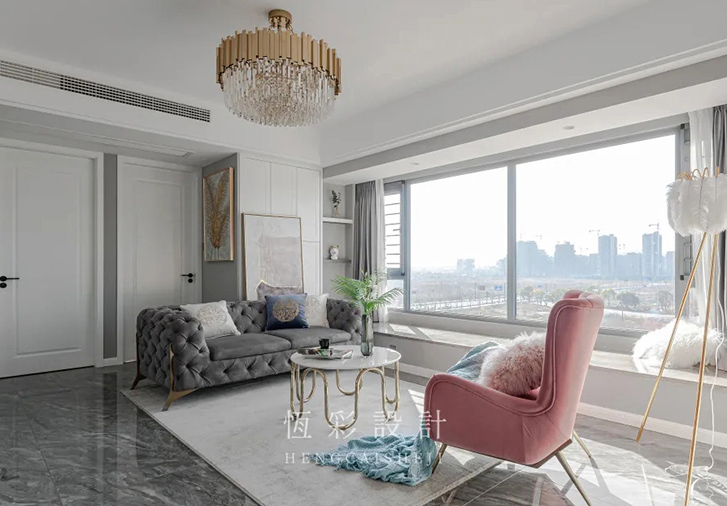 经典高级灰丝绒拉扣沙发搭配简约轻奢的小圆茶几,高级范儿十足。粉色单人沙发椅少女心满满。