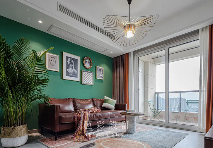 高纯度绿色乳胶漆背景墙,搭配复古棕皮质沙发,欧式古典金边装饰画不规则装饰,强有力的色彩表达之下,融入复古元素,别有一番味道。