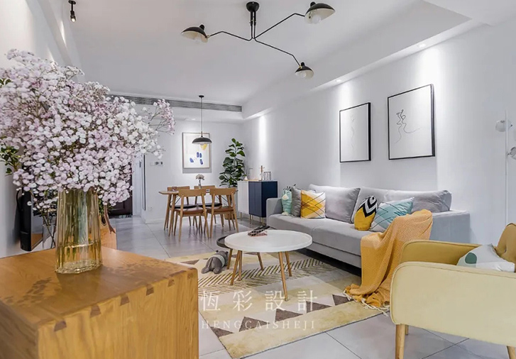 大面积白色背景墙,搭配极淡的灰白色布艺沙发,原木细脚与小圆几脚、电视柜相互呼应,黄色地毯和黄色单人沙发抱枕大面积提色,为整个空间塑造出主角色。